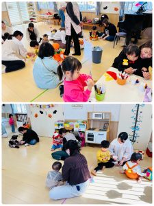 今週は、ハロウィン🎃を楽しもう!という事でハロウィンの絵本を読んで、ハロウィンの飾りやバッグを作ったり、モンスターのピンを倒すボーリングをしたり、お菓子をもらったりm、とお楽しみが盛りだくさんでしたね。おうちで、是非飾って下さいね!!